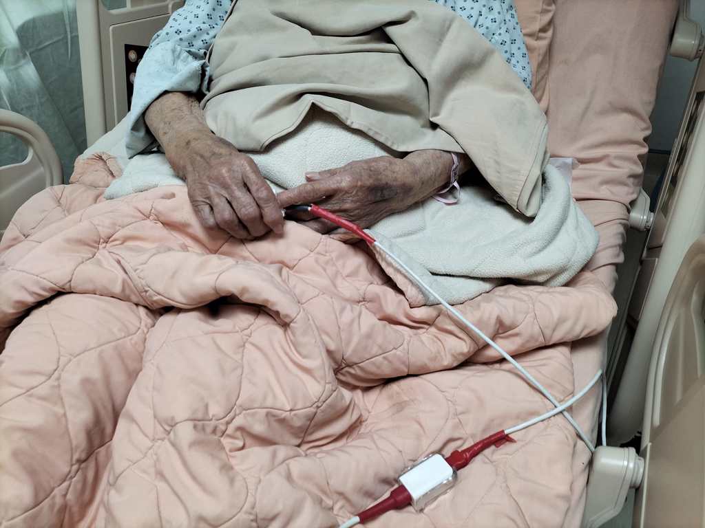 深夜10點,她下床上廁所,又從床上倒到地上,這次有點痛,我們打電話給家屬,女兒怕媽媽傷到骨頭,急忙致電醫院,當時送醫檢查仍沒事。