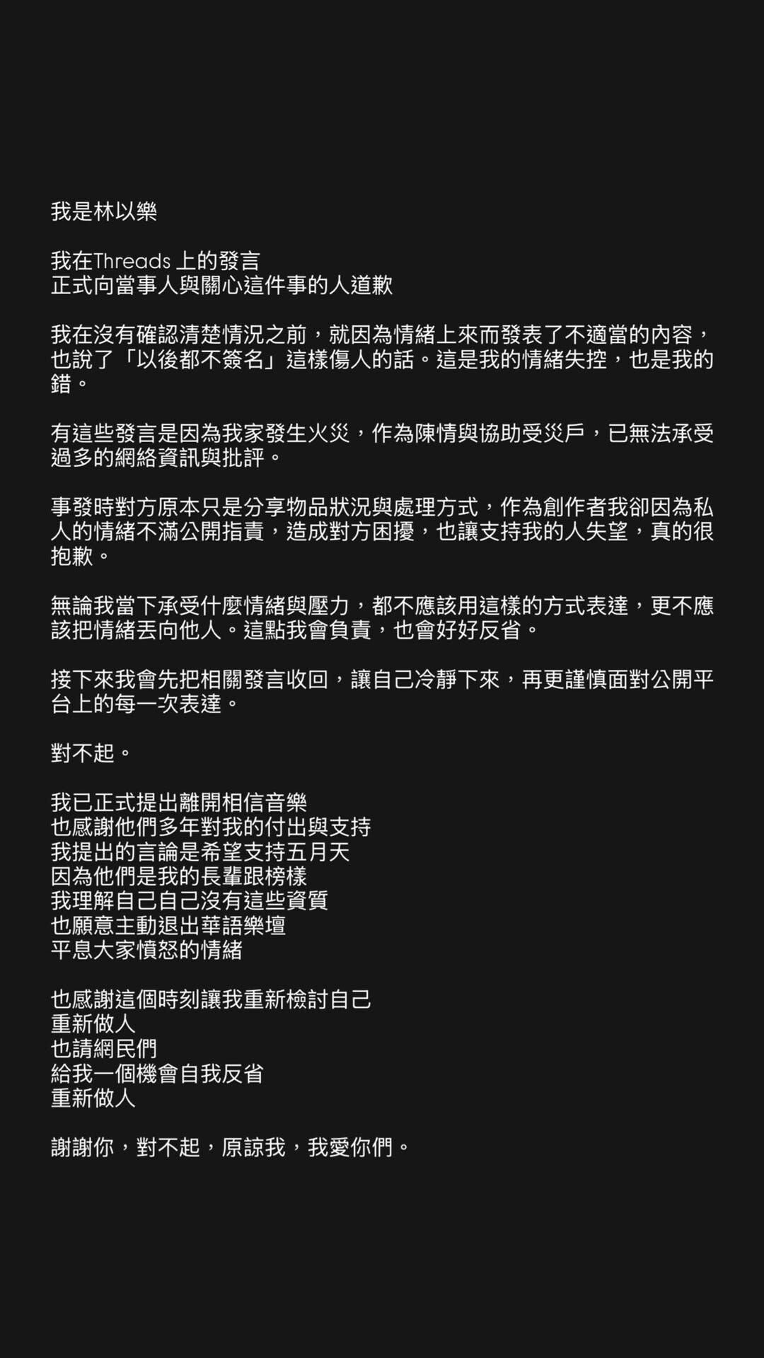 林以樂在文中表示,當事人原先僅是分享物品現況與處理方式,身為創作者的她卻因私人情緒公開指責,不但造成對方困擾,也辜負了支持者的期待。她宣布已向經紀公司相信音樂提出離開,並針對扯進五月天的言論特別說明,自己一直將五月天當成長輩與榜樣,本意是希望大家支持他們。最後她表示願意主動退出華語樂壇,平息眾人憤怒的心情,也感謝這次事件讓她能重新檢討自己,重新做人。