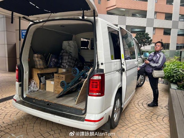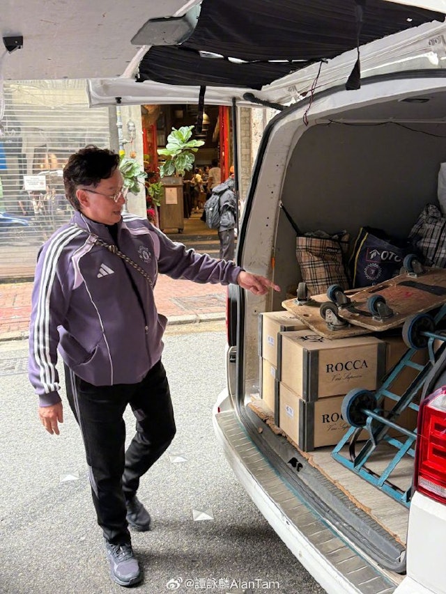 整個送貨過程中,譭詠麟完全親力親為,甚至直接坐在車尾箱休息,絲毫沒有大明星的架子。