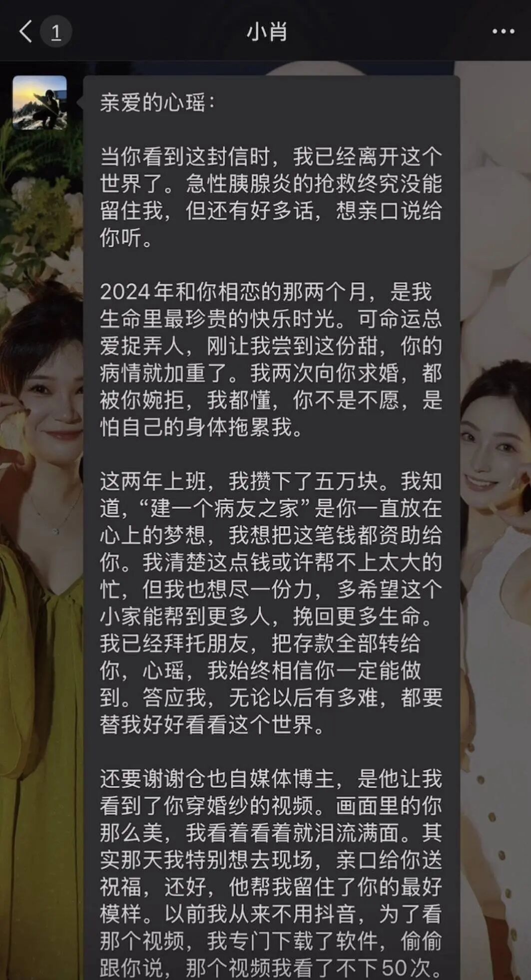 肖先生在遺書裡寫道:「這兩年上班我存了5萬元,我知道建一個病友小家是你一直放在心上的夢想,我想把這筆錢都資助給你。」
