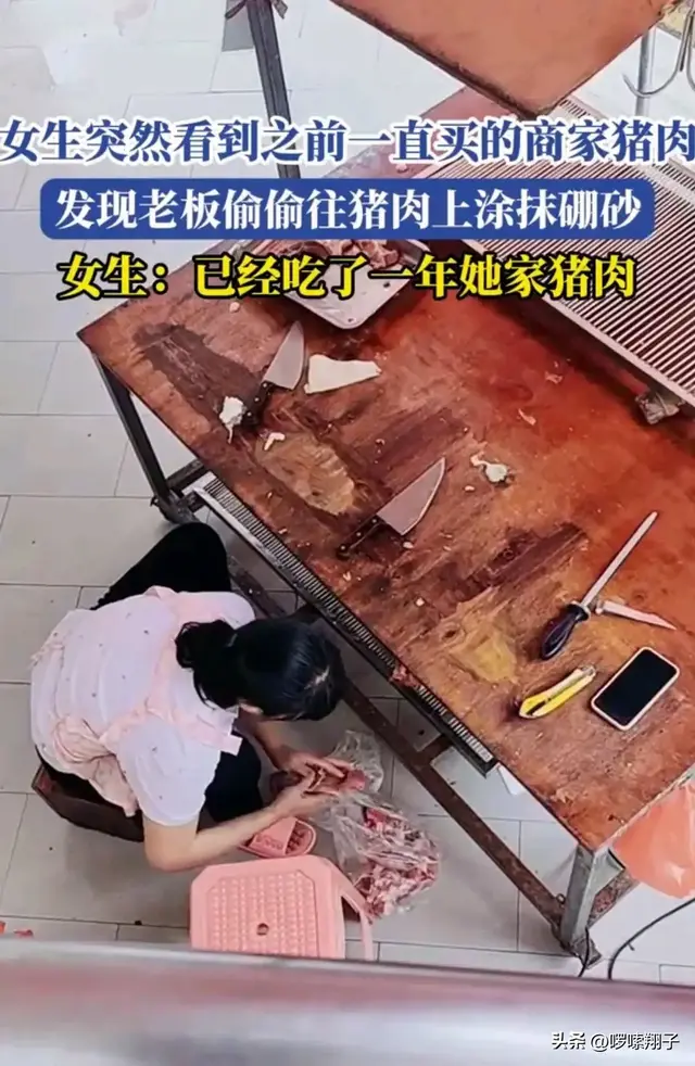博主去到二樓買東西,剛好下面就是剛剛買過的豬肉攤,可她發現在案板之下,攤主竟然鬼鬼祟祟的拿一個東西在豬肉上抹來抹去。