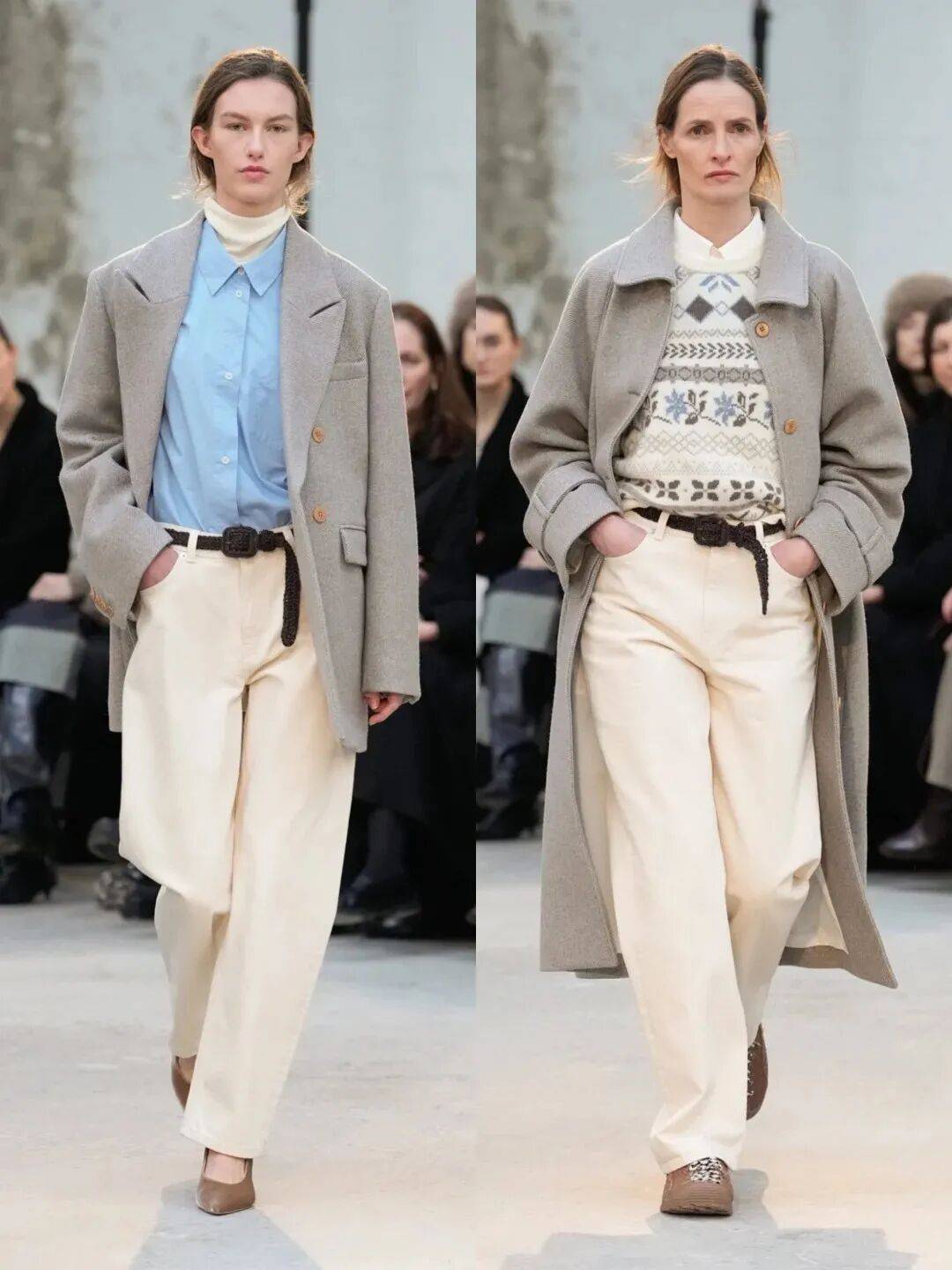 老錢風的外搭講究 「少即是多」,一件剪裁利落的深色西裝外套是首選,面料選啞光質感的羊毛或精紡呢料,避開亮面材質的浮誇感;如果想更顯鬆弛,也可以換一件駝色雙面呢大衣,自帶一種 「閱盡千帆」 的從容。