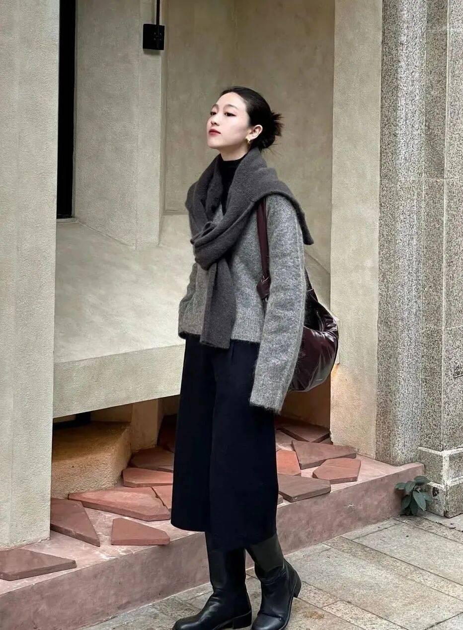 覺得毛衣單穿單調,不妨搭一條質感披肩:羊絨的柔軟披肩搭在肩頭,讓基礎款高領毛衣多了幾分復古腔調。