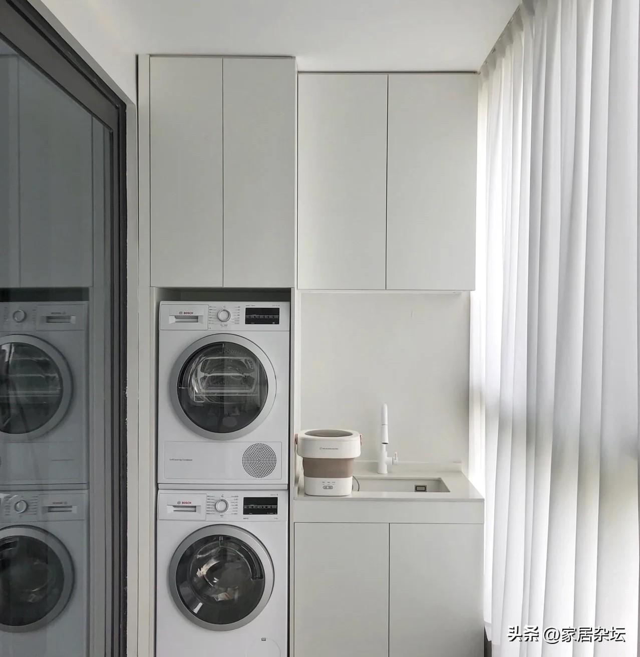 ①、陽台洗衣機的上面,要預留一個大的空間。這個空間是用來收納我們穿過的衣服,也就是準備洗的衣服可以塞在裡面。