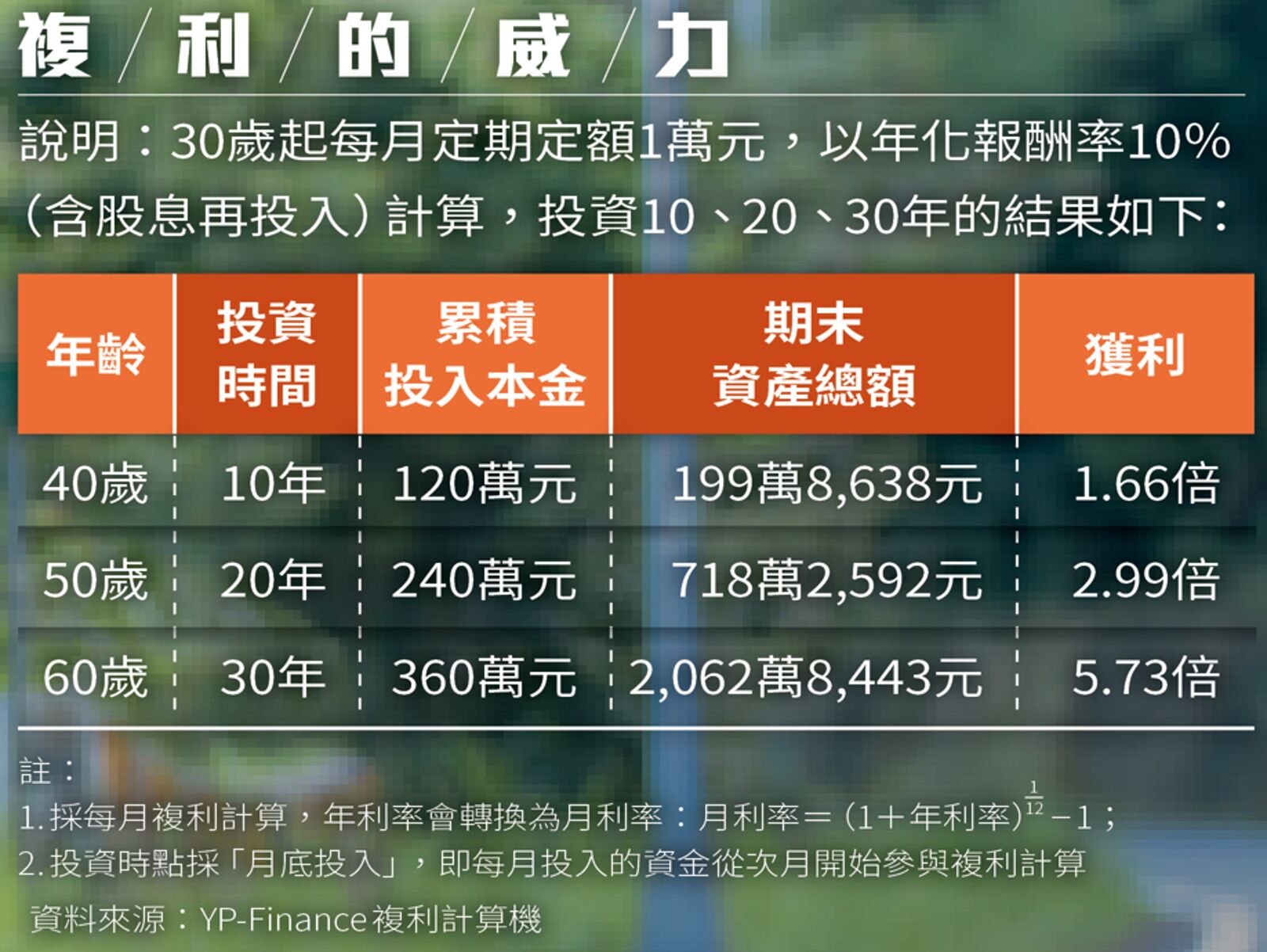 以年化報酬約10%來計算(含股息再投資),假如30歲開始每月定期定額投入1萬元,10年後投入本金120萬元,資產總額已膨脹至近200萬元;而到了60歲時,雖然總共只投入360萬本金,但透過時間複利的魔力,資產將有感成長至2,062萬元。