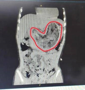 隨後,爸爸媽媽帶著萱萱、又趕到了常州市兒童醫院,門診醫生為萱萱進行腹部觸診,發現她的上腹部存在明顯腫塊。CT檢查顯示:孩子的胃被一個巨大的「異物」塞滿,與正常情況相比,被撐大了2倍,內部的陰影看起來混雜交錯,甚至有一部分已經延伸至十二指腸內。